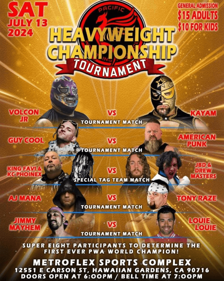 The road to the first-ever PWA World Heavyweight Champion runs through Hawaiian Gardens on Saturday, July 13, 2024! Pacific Wrestling Alliance brings a stacked Super Eight Heavyweight Championship Tournament to the Metroflex Sports Complex (12551 E Carson St, Hawaiian Gardens, CA 90716), featuring hard-hitting singles bouts, a special tag team showcase, and the kind of live energy you can only feel ringside.